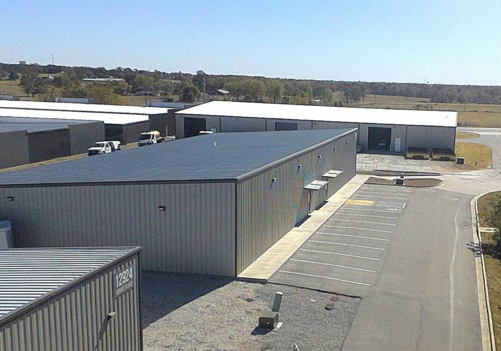 Open warehouse with five garage doors and bathroom.